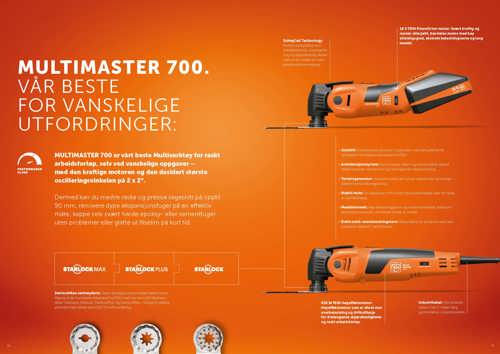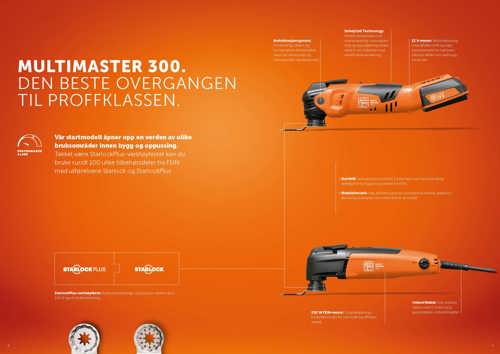 FEIN MULTIMASTER. DITT BESTE MULTIVERKTØY. NÅ I NY DRAKT! FEIN. ET SYSTEM BESTÅENDE AV MASKIN OG TILBEHØR, 1000 MULIGHETER: SAGING, SLIPING, POLERING, KAPPING, FILING, SKRAPING, KUTTING, RENGJØRING.