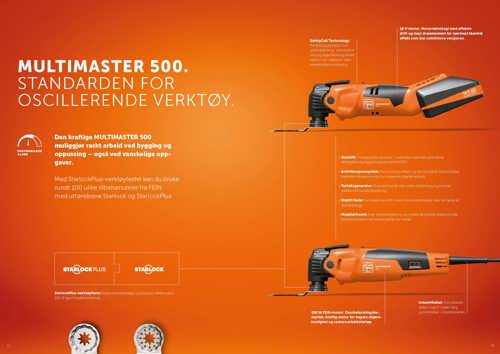 Den kraftige MULTIMASTER 500 muliggjør raskt arbeid ved bygging og oppussing - også ved vanskelige oppgaver. Med StarlockPlus-verktøyfestet kan du bruke rundt 100 ulike tilbehørsdeler fra FEIN med utførelsene Starlock og StarlockPlus.